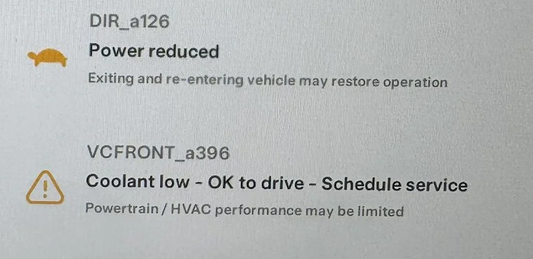 Remote diagnosis and fix Tesla "VCFRONT_a396 Coolant low OK to drive Schedule service"